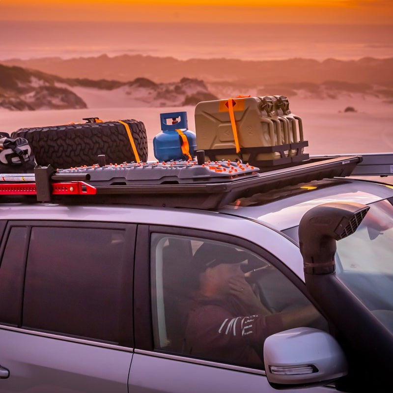 ARB's BASE Rack mount kit for the Land Cruiser 200 Series uses proven attachment methods to keep the roof rack as close as practical to the vehicle. It includes a wind deflector and is compatible with the rear OE mounted antenna. BASE Rack specific blade brackets suit the 61 x 51 in (PN 1770020) BASE Rack. By incorporating a dovetail extrusion around both the full perimeter and along each edge of the internal beams, the BASE Rack provides endless mounting and attachment options. Adding, removing and repositioning accessories and roof loads is quick and easy with the BASE Rack's dovetail system, making it easier to install and remove individual items without disturbing the whole load. Plus, unlike traditional roof rack channels, the BASE Rack dovetail extrusion won't collect dust and debris. Each BASE Rack accessory or fixture attaches to the rack with a simple clamp mount, including larger hardware such as Hi-Lift(TM) Jack mounts, rollers, recovery boards and even a BASE Rack custom light bar.