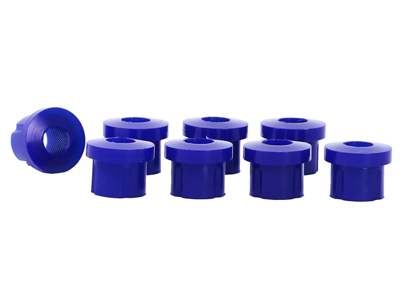 These bushings are often overlooked when upgrading the suspension of a 4WD. Leaf spring bushings stabilize the movement of the rear axle. Inferior, worn or damaged bushings in this area will cause the solid rear axle to move and impart rear end passive steer to the vehicle. It also causes the vehicle to "wander" all over the road and be unstable under heavy braking. This can be especially noticeable carrying a load or towing a boat, RV or any significant trailer. The OE rubber bushings are designed to work at standard ride height with standard wheels and tires and with standard loads. By fitting SuperPro Bushings the rear end of your 4WD will handle just about anything you can throw at it!