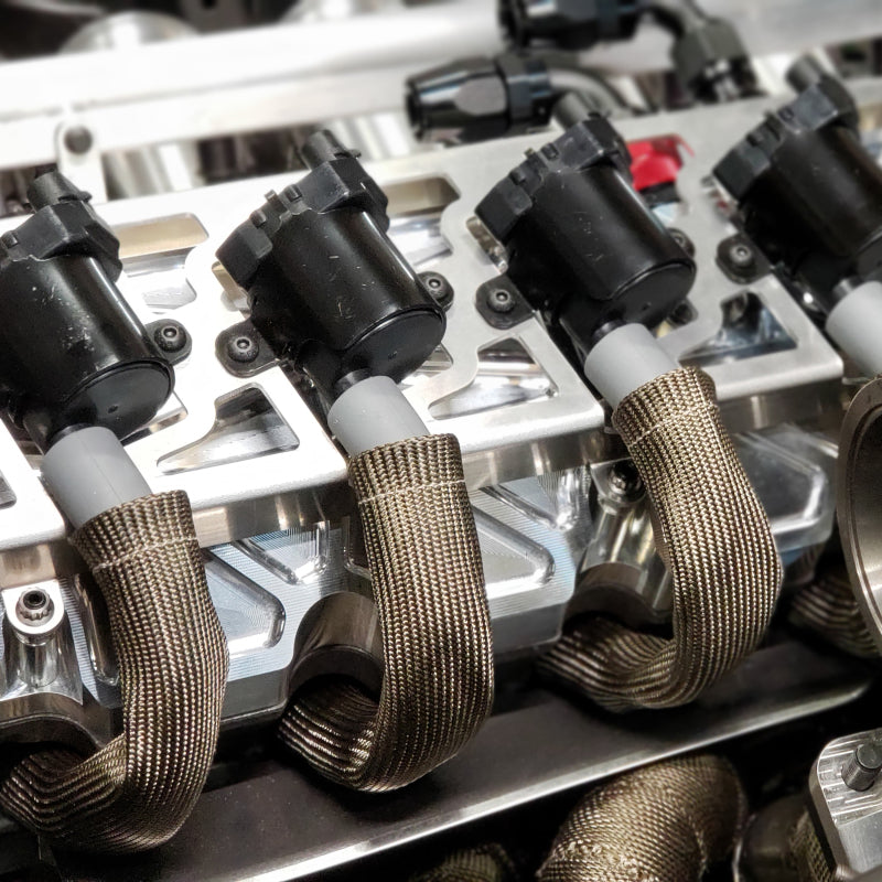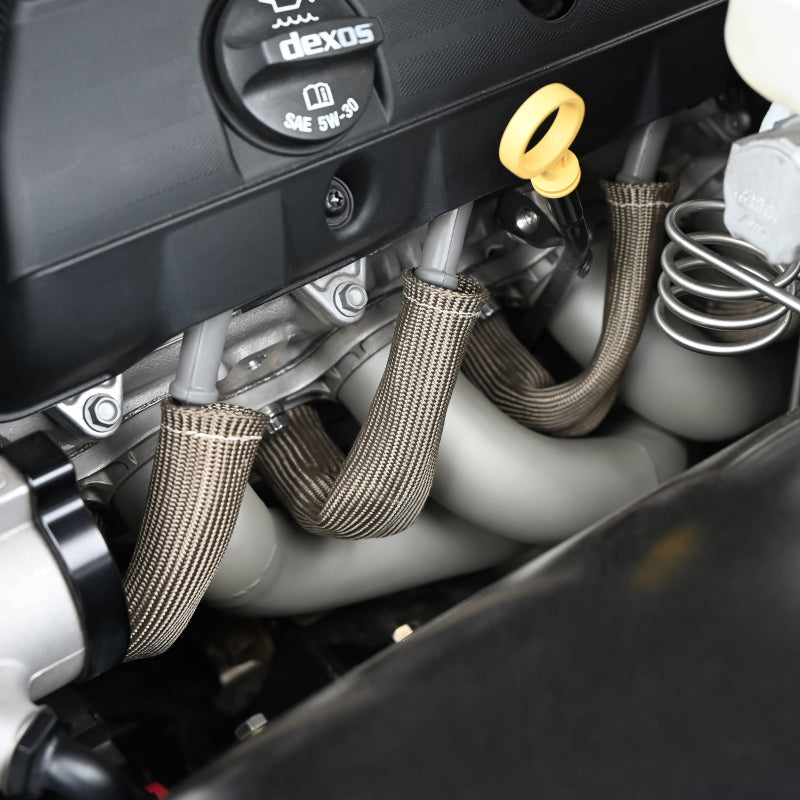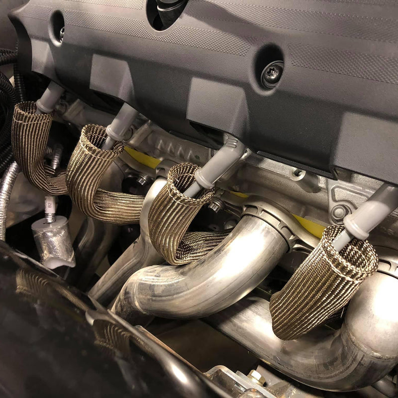 Titanium Protect-A-Boots are the latest in thermal protection technology for spark plug boot protectors. Developed from a unique material mined from lava rock, stranded and woven into a proprietary weave for added durability and strength yet is pliable enough to provide a universal fit for straight or angled boots. Titanium Protect-A-Boots are naturally resistant to heat, chemicals abrasions and contaminants, and are engineered to withstand temperatures up to 1800F (983C) of direct heat. High horsepower engine compartments are known for extreme heat that can put spark plug boots and wires at risk. With excessive heat generated from the exhaust manifold and headers the ignition system is vulnerable to the potential of burning, hardening and cracking of ignition wires and boots that could lead to arching, engine misfire and potential ignition system failure. Titanium Protect-A-Boots with LR technology, are engineered to handle extreme heat providing the ultimate protection for todays high voltage ignition systems for many applications including automotive, marine and powersports. The color and weave work together to give DEIs Titanium Protect-A-Boots a cool carbon fiber appearance that looks great under the hood - ideal for race, street, show cars and off road vehicles. Ultimate protection for spark plug boots and wires Withstands heat up to 1800F (983C). Our 6 in. Titanium Protect-A-Boots come with a reinforcement ring at the base for easy plug removal during maintenance. When working on boots with tight bends, try our 8 in. Titanium Protect-A-Boot XL Ringless instead. For thicker boots like MSD or Taylors we recommend our Protect-A-Boot Ringless Sleeves; the 1.25 in. diameter will allow for a simple install.Ultimate protection for spark plug boots & wires Non-flammable and protects against chemicals and resists water Double-wall construction for added durability Cool carbon fiber look Boots measure 6 in. L 2 boots per pack