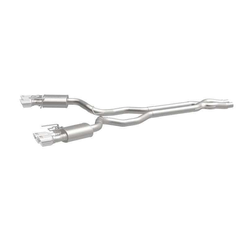 The MagnaFlow 2015-2020 Ford Mustang Competition Series Cat-Back Performance Exhaust System 19283 brings an aggressive, attention-grabbing edge to the deep resonant exhaust note we're so well known for. This exhaust kit is designed to enhance your 5.2L 2015-2020 Ford Mustang with dyno-proven performance made possible thanks to fast-flowing mandrel bent 3in. main piping and 2 Straight-Through mufflers ending in a Quad Split Rear exit with 4in. Polished Welded-On Double Wall Angle Cut Folded Edge tips featuring a sporty finish. The exhaust system's cat-back layout replaces your ride's exhaust system from near the catalytic converter on back. Exhaust system 19283 is engineered to make your vehicle's engine produce Aggressive exterior and Moderate interior sound levels, befitting its competition-oriented design. 19283's direct-fit design makes installation a breeze thanks to the use of advanced 3D scanning techniques. This performance exhaust system is made of 100% durable and corrosion-resistant stainless steel and produced using CNC precision robotic manufacturing, all backed by MagnaFlow's limited lifetime warranty. Please check to ensure compliance with local noise regulations.
